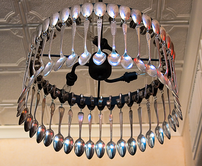 This beauty is the brainchild of the restaurant’s owners and was conceived while discussing the décor, explained chef Tom Fleming of Crossroads Diner. It is simply a series of wire whips from restaurant-sized Hobart mixers.