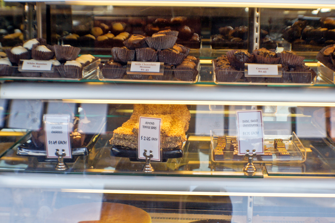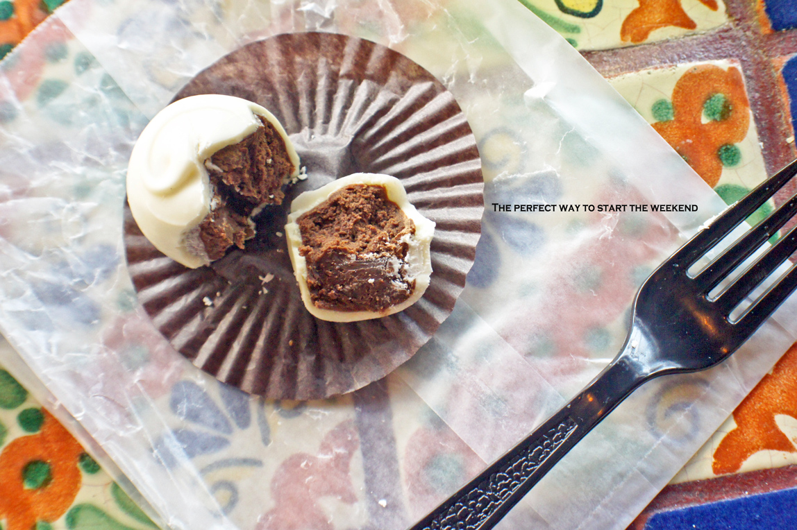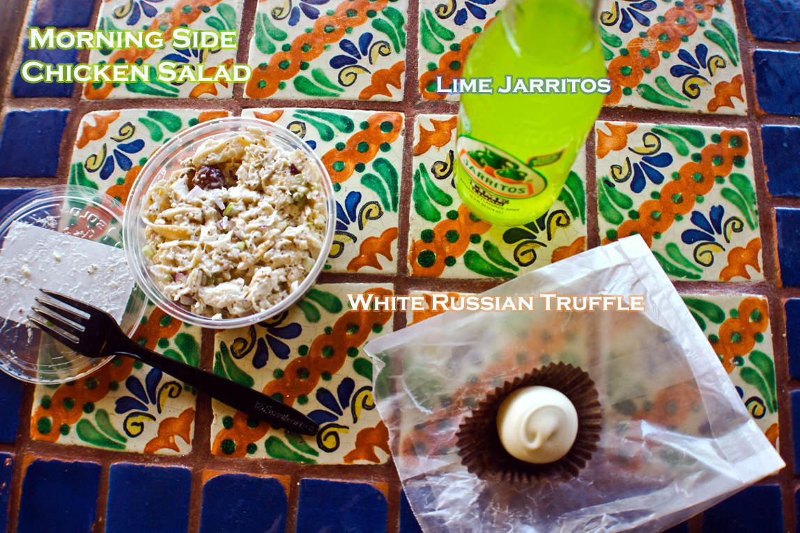 A family-owned business, Corner Market carries a wide assortment of drinks, including my personal favorite: vintage sodas in glass bottles. I couldn’t resist splurging and getting a Lime Jariscos, something about that bright neon green color and the feeling of a cold glass bottle against your hand just brings a smile to your face. To make my Friday even greater I opted for the Low-Fat Sonoma Chicken Salad made with all white chicken breast meat mixed with red grapes, celery and low-fat mayo with a White Russian Truffle on top. Oh oops, how did that get there? Before you judge me, I ask: How does one resist the enticing truffle and dessert spread they had right by the cashier? The rows and rows of plump, chocolate truffles whispering your name “Buy me, devour me, enjoy me…you know you want to.” I had to you see, isn’t that what weekends are all about?