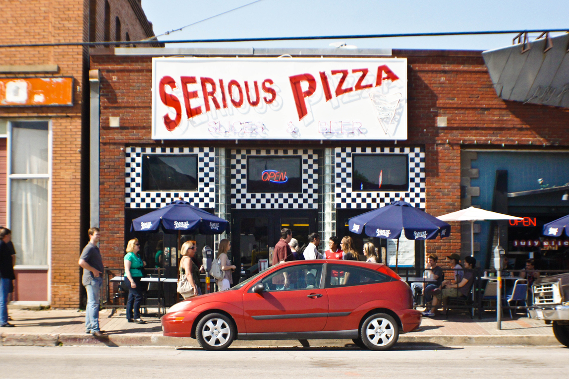 places were in Deep Ellum. Our first stop was Serious Pizza which had just opened on Thursday. Owner Mike Turley has the right idea for a neighborhood pizza joint: a no frills, casual hang out equipped with a bar and plenty of pizza, this is the place to go for college kids, partiers, and anyone who enjoys a good old fashioned GENEROUS slice of pizza. Did I also mention they’re open til 3 AM?