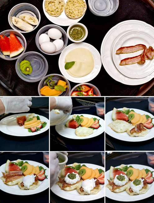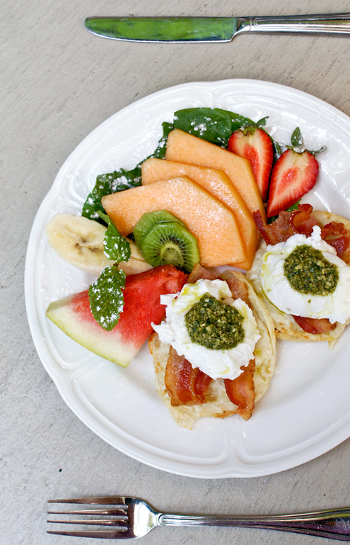 Brush the muffin with the garlic butter and pre toast for about 3 minutes, set aside. When ready to serve, cook the poached eggs in boiling water with white vinegar until soft hard, about 2 minutes. Top the muffin with the provolone cheese and put in the oven to melt the cheese, in the same time warm the crispy bacon. Top the muffin with the bacon, eggs and finish with basil pesto. Place in the plate at 3 and 9 and the fruit at 12. Clean the plate and serve.