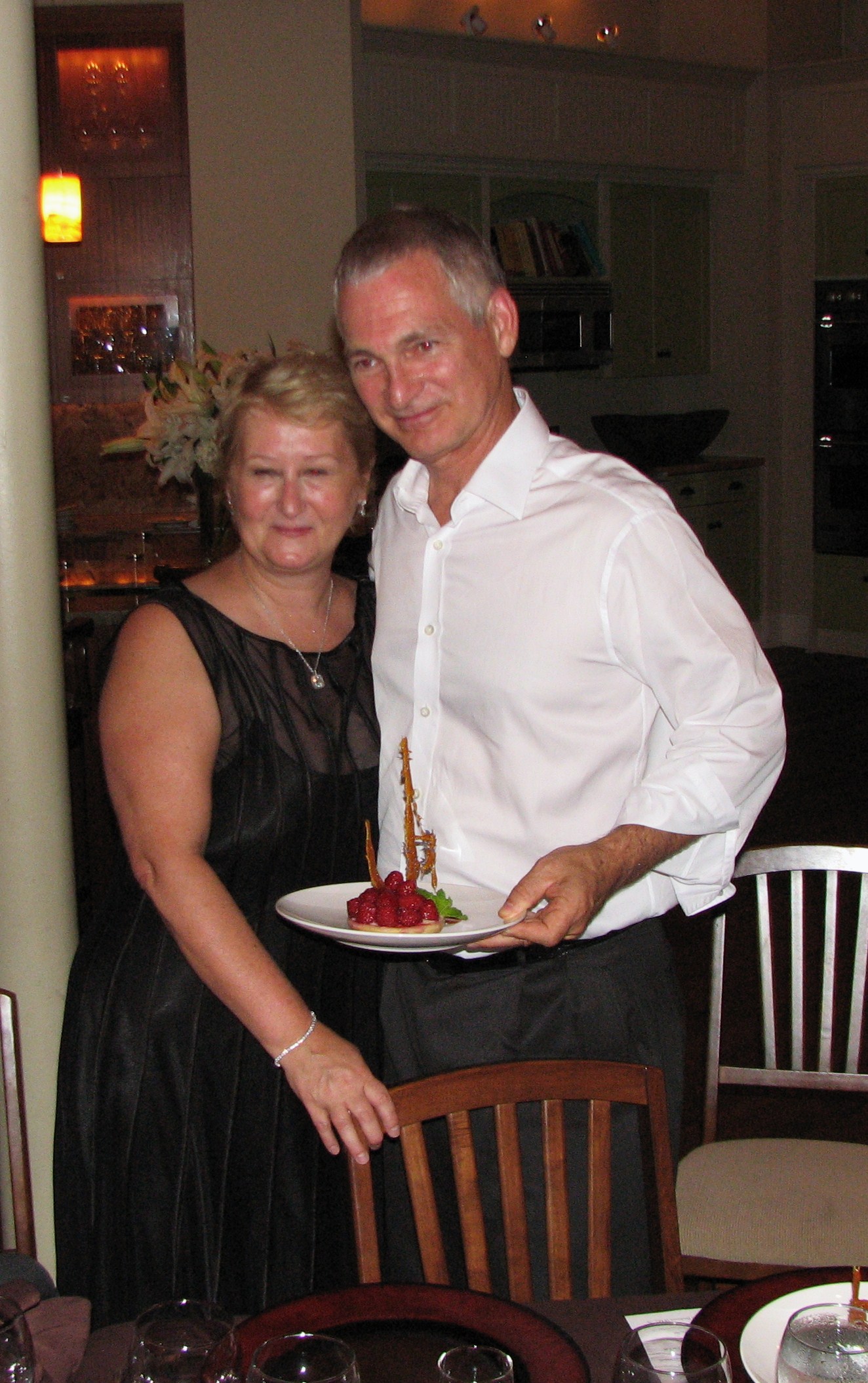 The chef for the evening was Milestone’s Andre Bedouret who worked for a week preparing this excusite meal for the group, along with a full staff of chefs that are friends of the couple. Pictured is Bedouret and current Master Chef contestent Jennie Kelley as they hold the Raspberry tart that is a replica of the very tart Sharon and Jerry almost shared on their wedding night. The tart was a surprise for Jerry.