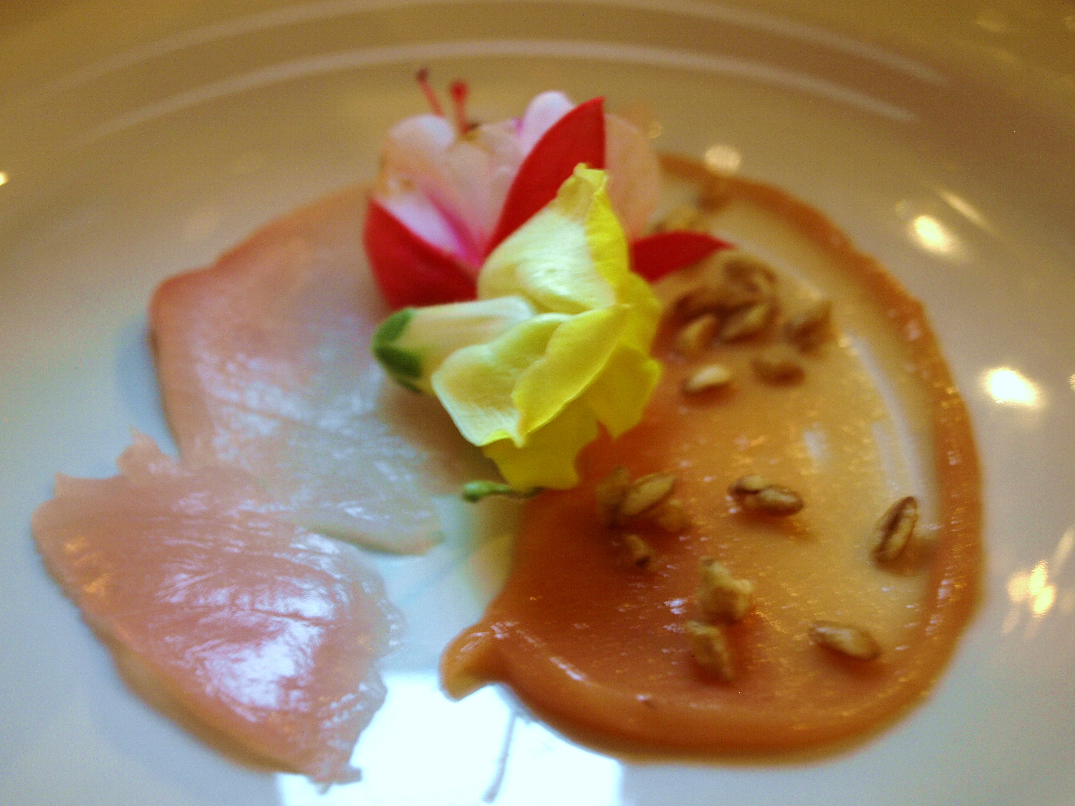 The fish was silky and slightly sweet, playing nicely off the tart guava and slight bite from the chives. The faro pieces provided that textural crunch to complete the bite. First impression: what the hell did Leslie Brenner eat? This is not one star food, more like 3 or 4 star. It also was a great pairing with the wine, which had a lot of honeysuckle, apricot, pear and pineapple upside down cake on both the palate and the nose. Great start to the meal.