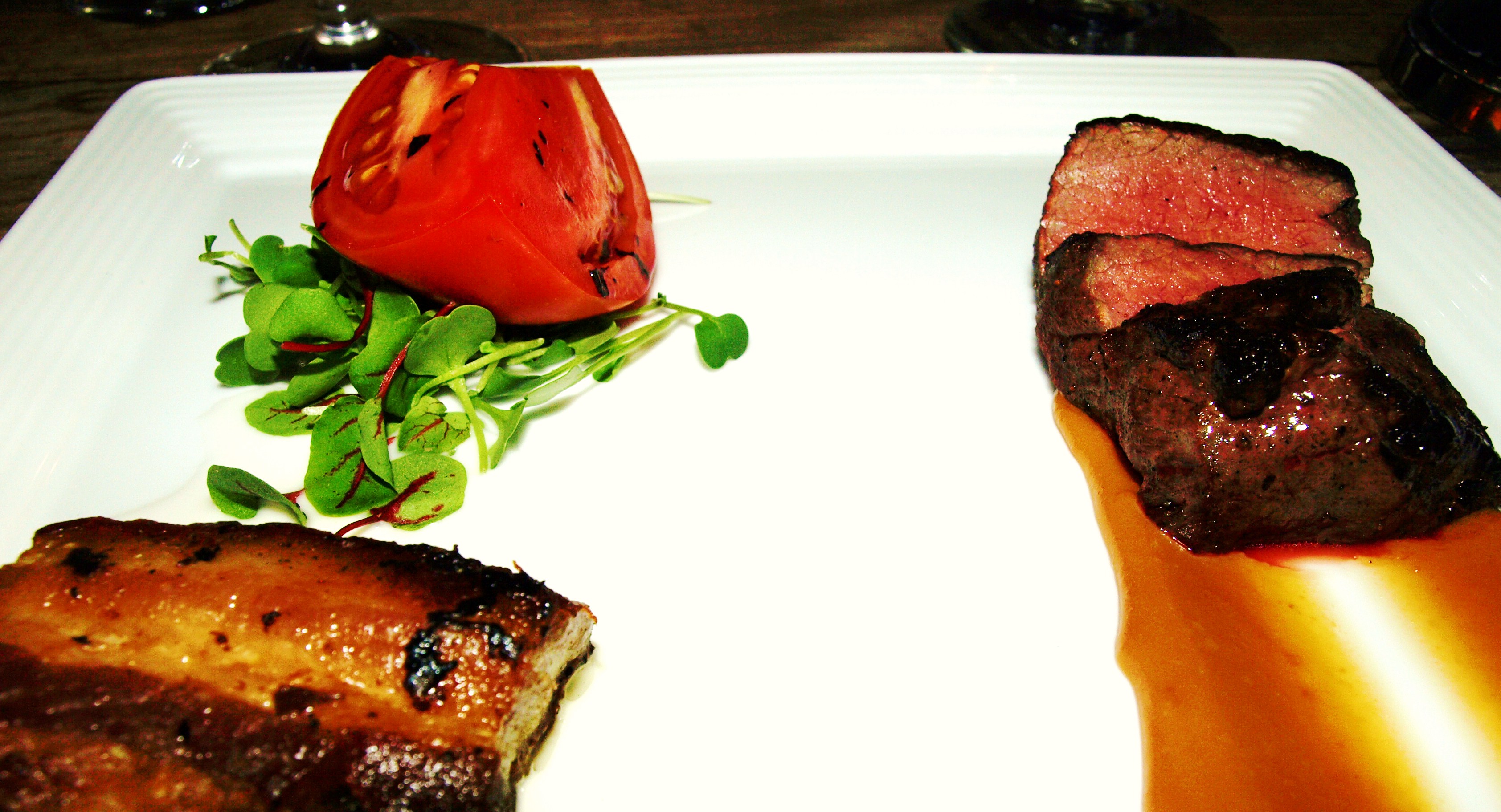 Course 4: Roasted New Zealand Elk, fennel pollen pork belly, Lemley tomato, goat milk foam, Pedro Ximenez, cajeta, and micro greens paired with 2007 Napa Valley Cabernet Sauvignon