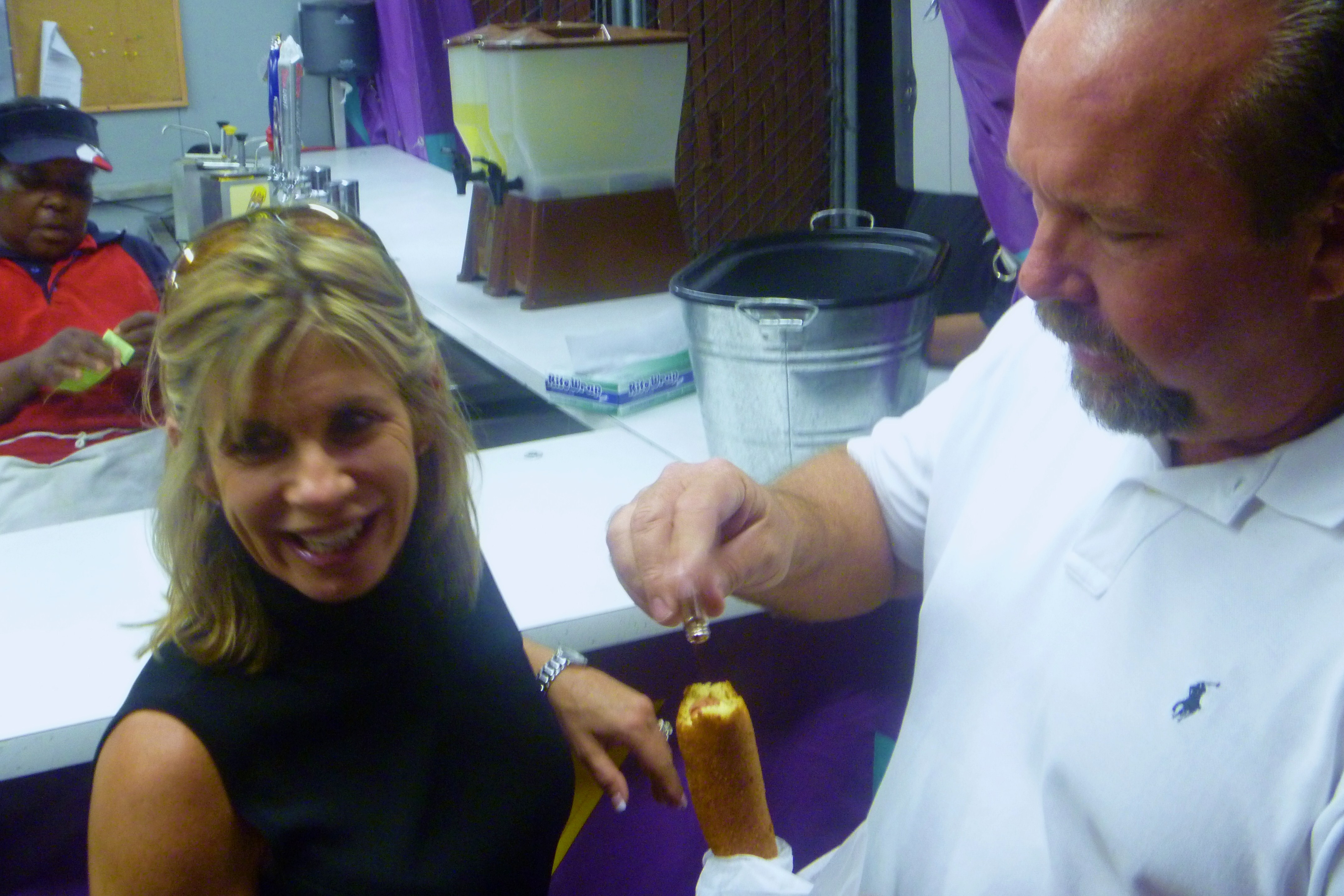As we chatted a couple from Austin, Charlie and Katy Parker, walked up to buy their 6th corny dog of the day, but their record is 7. They make the trip to Dallas each year just for these corny dogs.