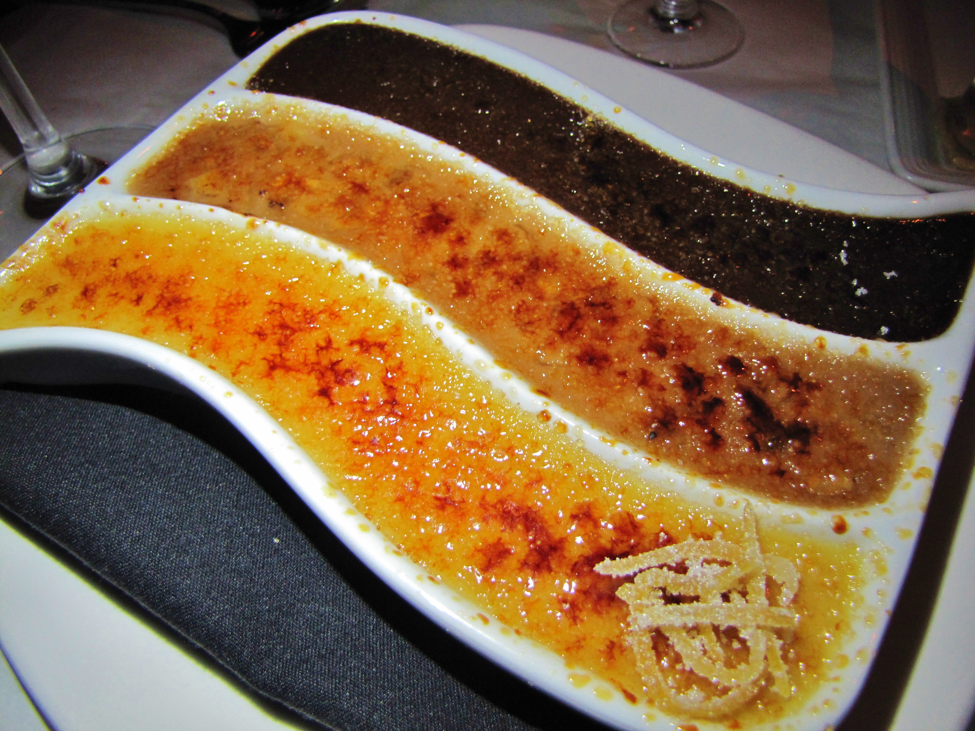 I was chatting up Fearing pastry chef Jill Bates this week and she mentioned she would never make a creme brulee. She sad it was so 80’s. Well, I will admit it got a little tired (a LOT tired) but this triple crown version from ZaZa’s Dragonfly made by Dan Landsberg is sublime. It’s the Three Amigos of Brulees. The flavors are lemon basil, strawberry-banana and mocha. C’mon Jill, this looks pretty good.