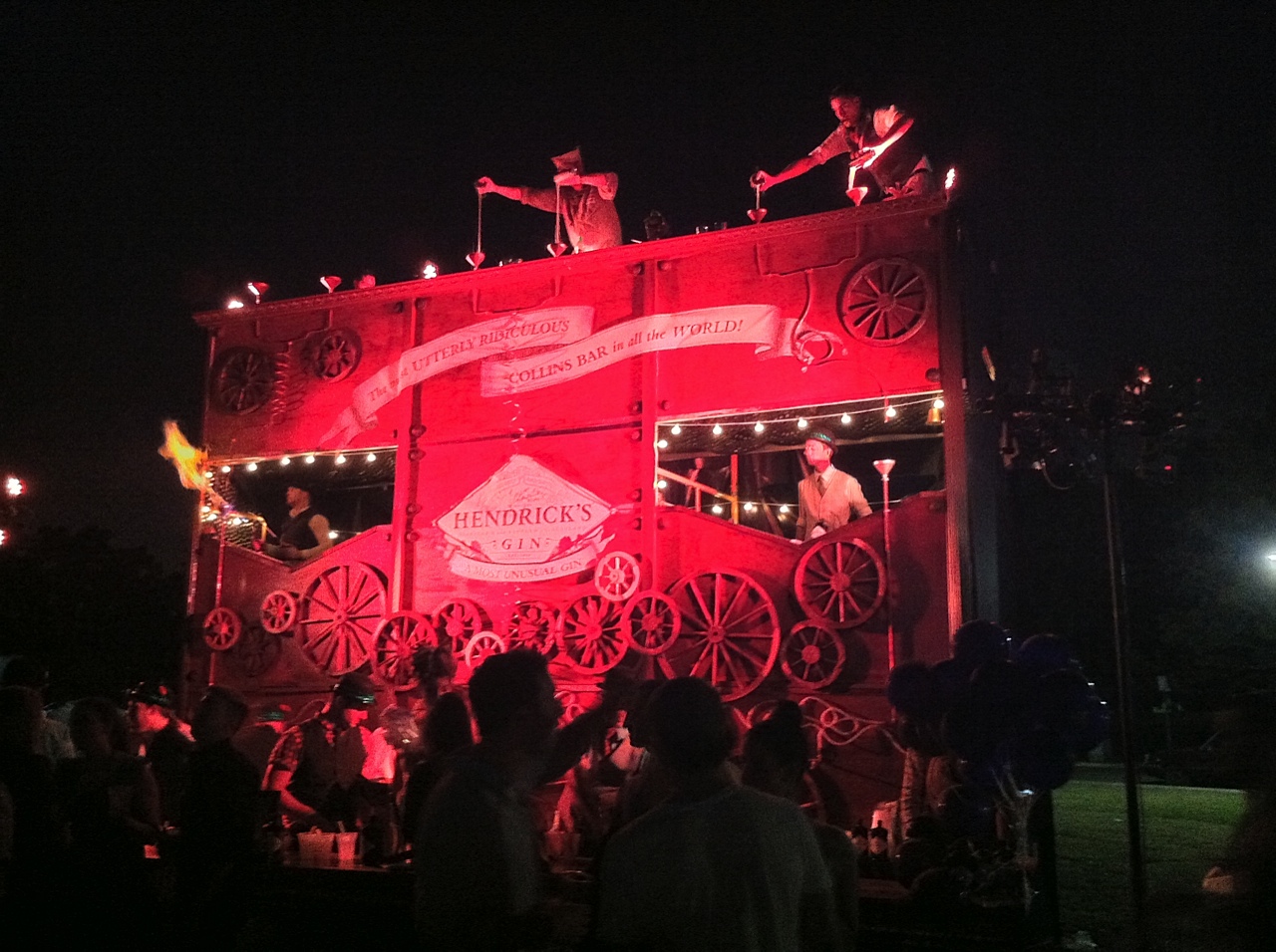 Among the memorable sights and sounds were a live burlesque show from Sailor Jerry’s rum; a guy on a trampoline doing flips and jumping around to shake Monkey Shoulder Cocktails outside the Slap & Tickle Village; a circus sideshow-worthy multi-level bar from Hendricks Gin dubbed “The most utterly ridiculous Collins bar in the world”; all culminating in a fireworks show set to discoed-up live bagpipe music. Yep, bagpipes.