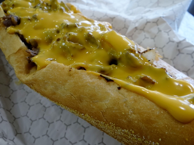 We checked out the tiny shop which is painted in a garish yellow and black motif — she is Asian and he is African American, thus the color scheme. The largish signage outside promised a pretty good Philly Cheesesteak which initially prompted our visit, but we stayed to soak in the couple’s enthusiasm for 6-month old business and pretty much life itself.