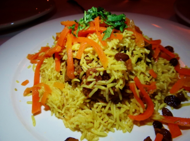 Lamb Qabili Palao is seasoned lamb served over a saffron rice and covered with sweet carrots and raisins