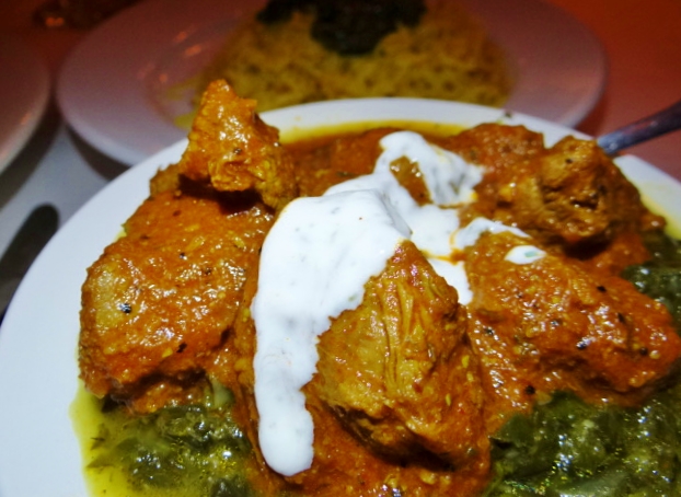 Lamb Sabazi Chalao is simmered spinach with garlic, onion, leek and spices served with lamb or chicken and a side of rice