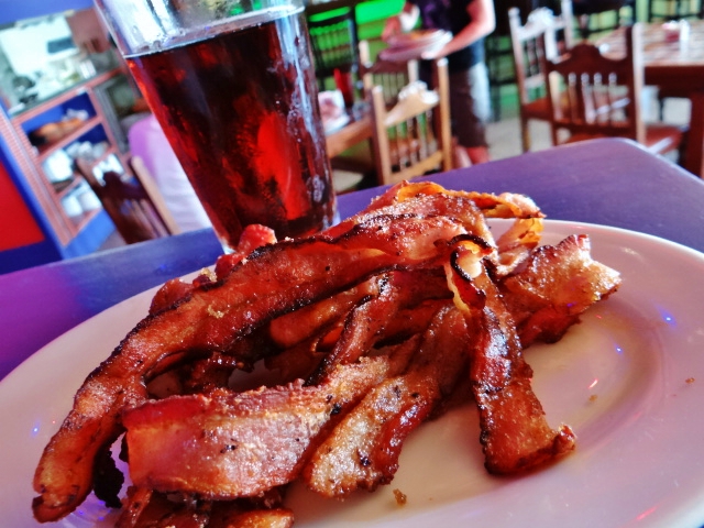 We had not yet reached pork saturation so we dashed over to Mextopia, home of the Bacon Happy Hour. Yes, an actual happy hour devoted to bacon. Order a beer and you are supplied plenty of bacon that is seared with brown sugar and spices. Genius.