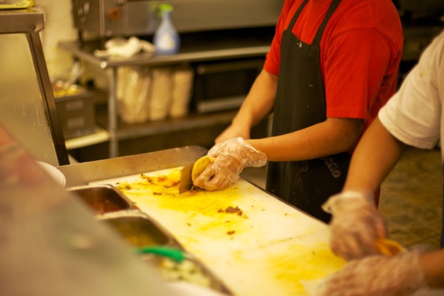 If tacos are not on your agenda for the take down then perhaps the Sopes may be of interest to you as well. Sopes resemble thick tortillas and sometimes mistaken for gorditas, but these little crunchy goodies are fried then topped with whichever of the 15 meats you choose. As the same process as the tacos, the Sope is handed down from one staffer to another, and topped with refried beans, meat of choice, lettuce/tomato and crema (an acidified cream). Once again, you are supplied the 3 different salsas. Sopes are sold 3 for $5.75, which breaks down to a little less than $2 per each.