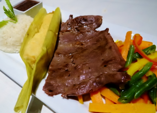 Carne Asada Cecina (smoked dried meat) served with house salad, black beans, rice onions and a tamale