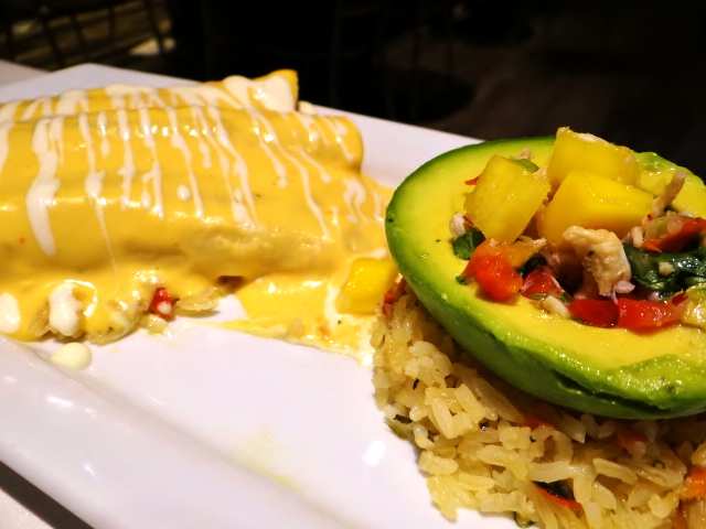 Enchiladas de Langosta Lobster enchiladas served with a bell pepper cream sauce and served with a stuffed avocado with crabmeat, mango and pico de gallo