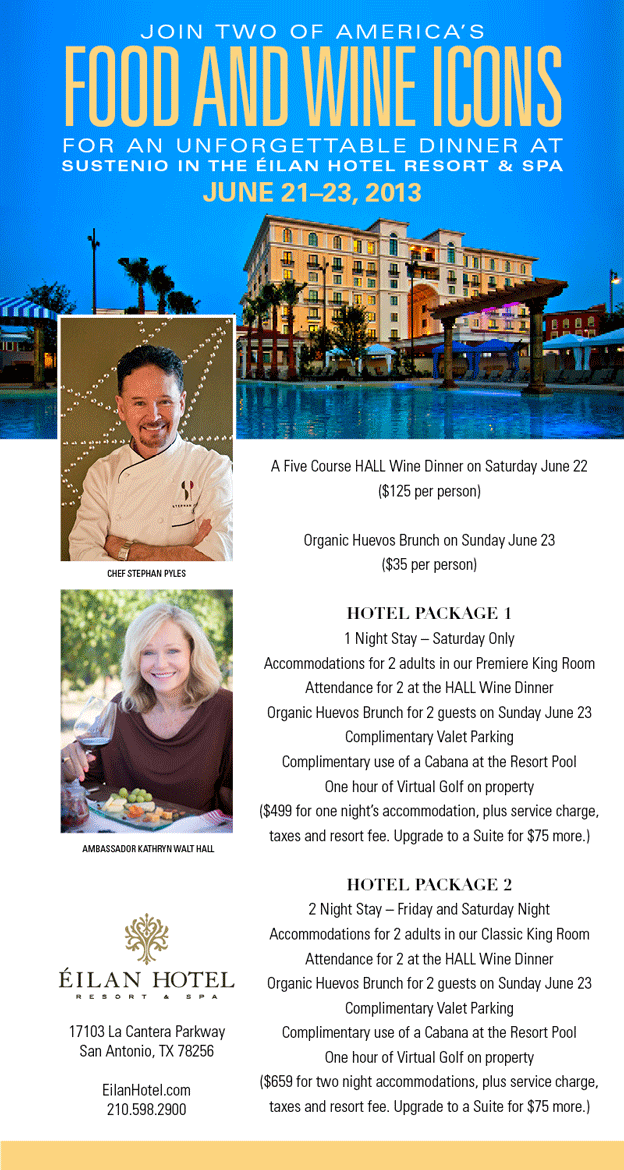 June 22nd: Hall Wine Dinner at Stephan Pyles, Sustenio. Fly to San Antonio from Love Field and stop at Stephan Pyles takeout place in the terminal on your way to his upscale restaurant in the Eilan Hotel Resort and Spa. The Hall’s hail from Dallas and make one of the bargains among top tier Napa Cabernet Sauvignon. A 90+ point wine for about $50.