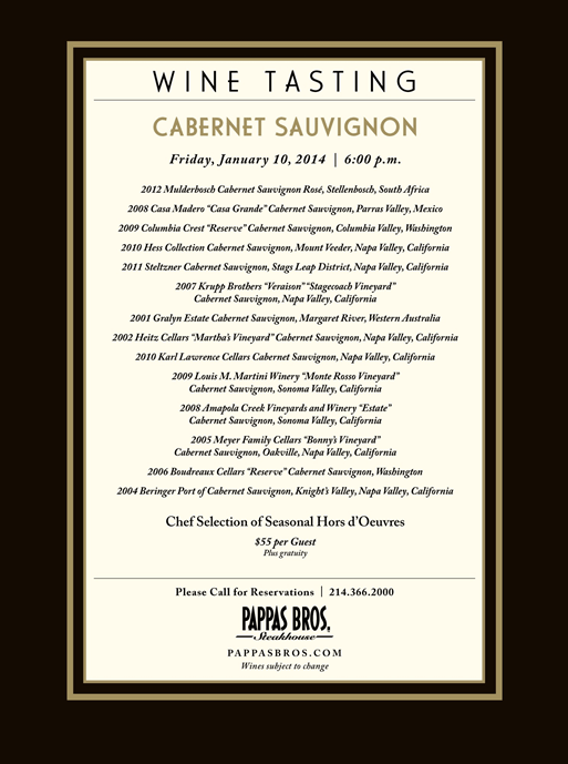 Passed Appetizer Chef’s creation to stimulate the palate Oak Cliff Cellars 2012 Lake County Sauvignon Blanc Salad Jumbo Crab Meat, Roasted Poblanos, Avocado, Radicchio, Pumpkin Seeds & Prickly Pear Vinaigrette Oak Cliff Cellars 2011 Sonoma Chardonnay Intermezzo Juniper & Porcini Braised Beef, Parmesan Polenta, Caponata & Natural Veal Sauce Oak Cliff Cellars 2011 Wild Diamond Mourvedre Entree Duo of Seared Duck Breast & Duck Confit with Wild Mushroom, Olive and Cavatelli Pasta Oak Cliff Cellars 2009 Firebrick Zinfandel Dessert Spiced Cherry-Chocolate Bread Pudding with a Vanilla-Candy Cane Gelato Oak Cliff Cellars 2010 Firebrixo Dessert WineOn Friday January 10th, Pappas Bros. Steakhouse is holding a tasting of 14+ examples of America’s most popular red wine, Cabernet Sauvignon. The selection is A-grade as the announcement below attests. Most are from that epicenter of American Cabernet Sauvignon, Napa Valley. However, don’t overlook the three Sonoma examples, and perhaps the most intriguing is the Casa Madero from Mexico!