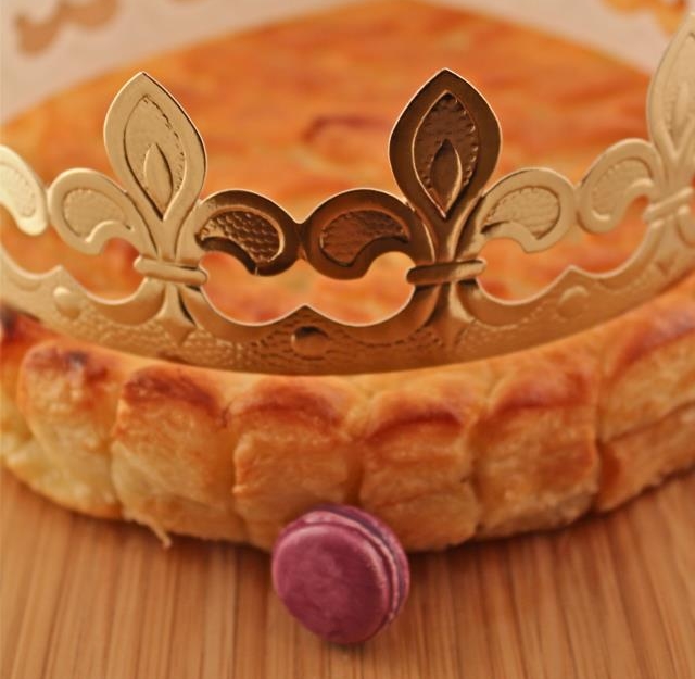 The Galette des Rois is a supple cake made with puff pastry and a frangipane (almond flavored custard) filling. Originally the cake included a hidden bean that designated the finder as king for the day. Now it is traditional to find a plastic baby, but Village makes theirs more interesting by hiding a French macaron.