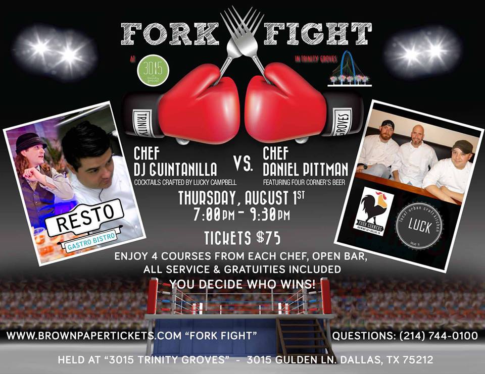 Fork Fight is a bracket-style battle between the soon-to-open restaurteurs in Trinity Groves, ten in all. The first few battles were meaty and furious, with tight but decisive victors who have moved up the line for a future competition. The last two Fork Fight battles were sold out, and the next fight will sell out very soon.
